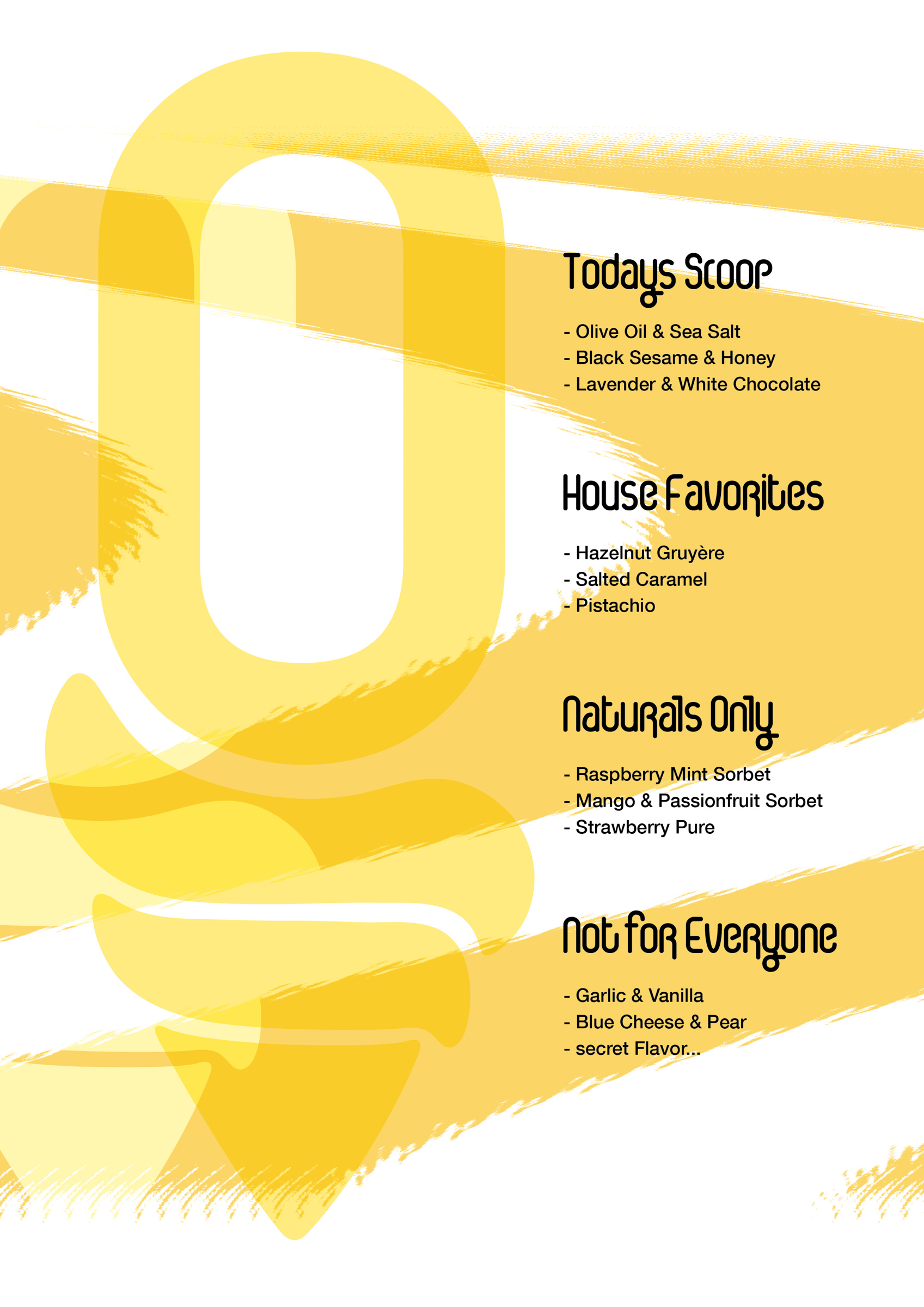 Das Muster im Hintergrund soll an ein schmelzendes Glace erinnern, und die Fontwahl ist ein wenig von Gelateria di Berna inspiriert.